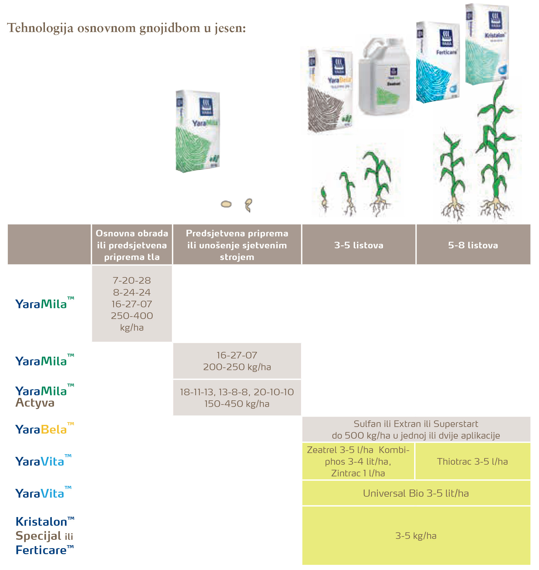 Folijarna prihrana: YaraVita™ Zeatrel (sadržava P, K, Zn) namjenski razvijeno folijarno gnojivo za kukuruz. YaraVita™ Tiotrac (N,S), povećanje kvalitete, YaraVita Kombiphos, univerzalno folijarno gnojivo sa algama YaraVita Universal Bio.