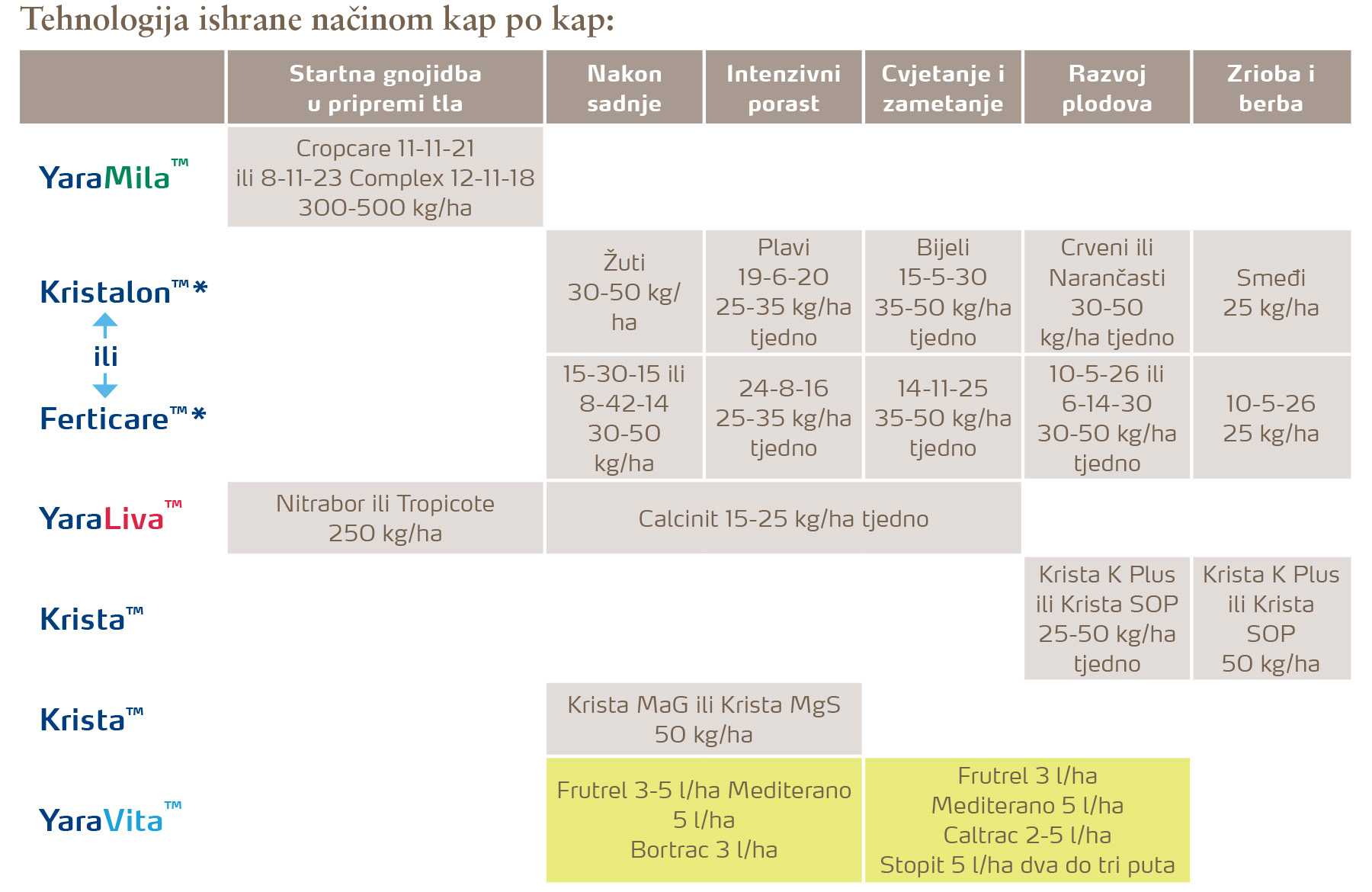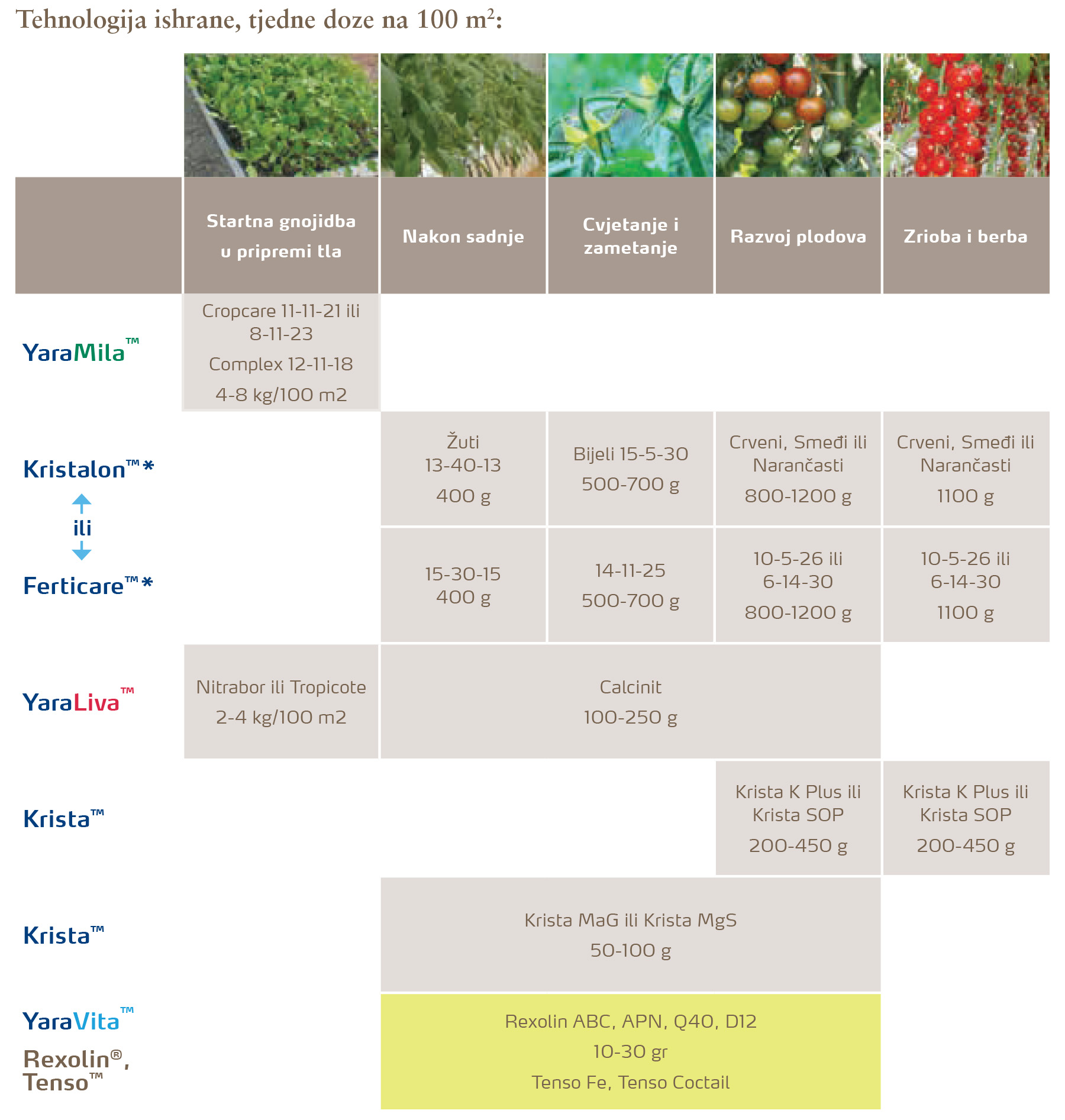*Napomena: Izaberite samo jedan tip vodotopivih gnojiva, ili Kristalon™ ili Ferticare™. U tablici su prikazana oba programa i preporučene tjedne doze u količinama koje ovise o razvoju i kondiciji usjeva.