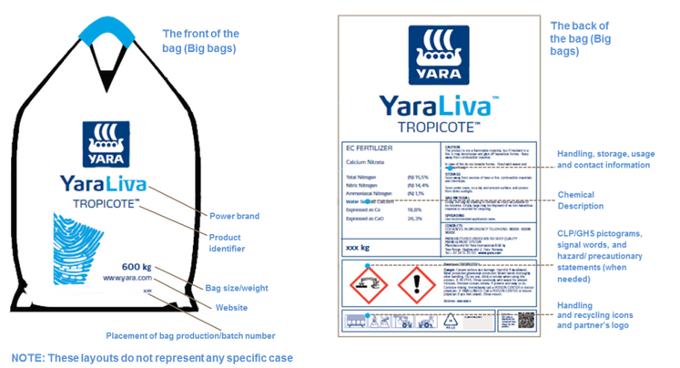 Porijeklo proizvoda uvijek je navedeno na vreći. Prednja strana svake Yarine vreće, i velike i male, obilježena je za potrebe prijevoza (TDG etiketa). Stražnja strana velikih i malih vreća uobičajeno sadrži etiketu u skladu sa CLP i TDG regulativama. Koristimo kombinirane etikete, osim u sljedećim slučajevima: