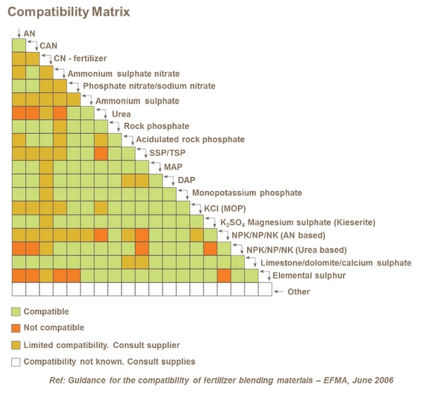 - Proizvode koji nisu kompatibilni nemojte skladištiti jedne blizu drugima - na primjer, urea ne smije biti u blizini dušičnih gnojiva; držite ih na što je moguće većoj udaljenosti. Nikada ne miješajte gnojiva koja prethodno nisu bila adekvatno uskladištena. Držite vapno i gnojivo na što većoj međusobnoj udaljenosti. (Konzultirajte matricu kompatibilnosti ispod te fizička svojstva gnojiva)