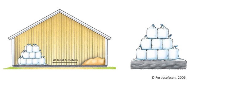 - Pri skladištenju na otvorenom prostoru, postavite prazne palete povrh pokrivenog gnojiva radi zaštite od oštećenja koja bi ptice mogle napraviti na ceradi i vrećama.